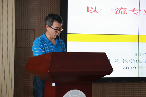 随后,张树永以 “以一流专业建设为契机,全面提升人才培养能力和水平”为题作报告,分别从建设一流本科的形势与任务,哲学、社会学建设一流本科的形势,一流专业建设与三级认证与当前迫切需要开展的工作这四项内容阐述了学院本科建设的迫切性与重要性。张树永在报告中详细说明了一流专业建设与三级认证的培养目标、毕业要求、课程体系、团队队伍、条件支持、质量保障、员工发展这七项三级标准。指出学院本科教学达到一流专业建设与完成三级认证要明确培养目标、提高员工毕业要求、完善课程体系建设、增强团队力量、加强教学条件支持、完善教学质量保障体系、注重员工全方位发展。最后,张树永提出要进一步学习领会一流专业建设的本质,实现专业建设以员工为中心,以产出为导向与质量持续的改进;进一步修订专业人才培养方案;全面制订和落实质量标准;改革教学理念和方法;大力改革考试制度;建立系统的质量保障机制。