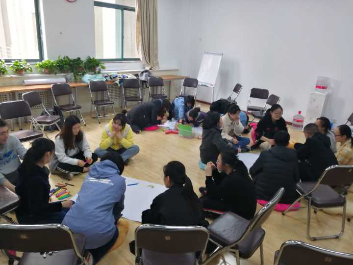 两点左右,李晓含老师进行了自我介绍,就到场同学的辅导目的进行询问,并阐述了老员工心理健康咨询与辅导的重要性,与进行心理辅导的团体成员建立了基本的信任感。接下来第一次心理健康团体辅导便正式开始了。首先通过“大风吹小风吹”的游戏,同学们彼此有了初步的认识和了解,为本次活动的开始营造了一种放松欢快的氛围。之后通过“讲述名字背后的故事”,团体成员之间有了进一步的交流与熟悉,并对各成员的名字有了深刻的记忆,有利于下一步团体辅导工作的开展。然后通过抽签,团体成员共分成三个小组,团体辅导工作进行到小组合作活动阶段,各小组在李晓含老师的指导下明确了“白纸活动”的任务:确定队名、制定规范、共同作画、寻找队长。各小组在愉悦的音乐声中,积极准备材料、交流意见、开展活动,活动场面十分热烈。随后,组长吕奕涵、姜晴、李国艳分别介绍了彩虹队、葫芦兄弟队、再差一个就能召唤神龙队的队名寓意、队员特点以及规范要求。最后李晓含老师进行了活动总结,第一次心理团体辅导便圆满结束了。