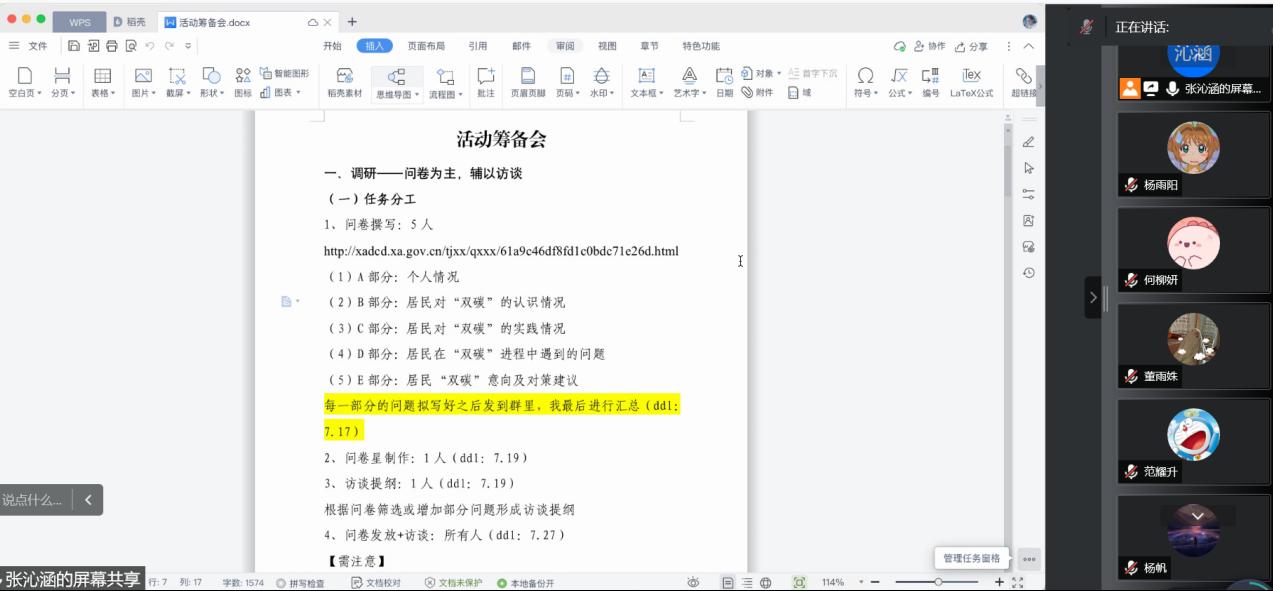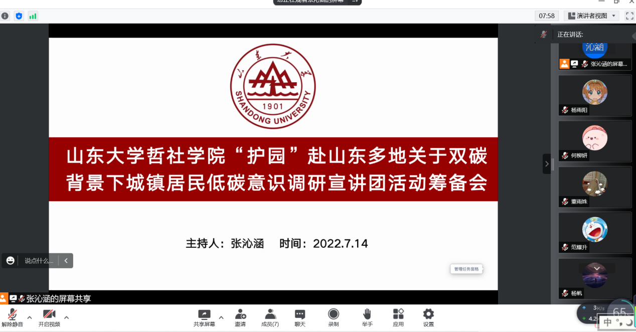 2022年7月14日晚8时,beats365亚洲版“护园”赴山东多地关于双碳背景下城镇居民低碳意识调研宣讲团在腾讯会议上召开暑期社会实践活动筹备会。队长张沁涵主持,来自哲学、社会学、新闻学专业的6名团队成员参与。