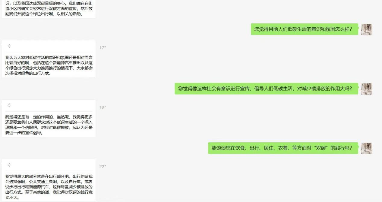 访谈工作采用半结构式访谈法,团队成员通过线上腾讯会议、电话访问、线下面访等多种方式开展一对一访谈。结合前期拟写的访谈提纲以及受访者的问卷填答情况,团队成员询问受访者对“双碳”的认识和实践情况,并了解其在“双碳”实践过程中面临的困难。此外,不少受访者尝试从政府、学校、企事业单位、居民等各个主体的角度提出实现“双碳”目标需要改进和深化的方面。倾听民意,广纳民智。这些宝贵的意见和建议反映出居民在“双碳”事业中不可或缺的主体作用。