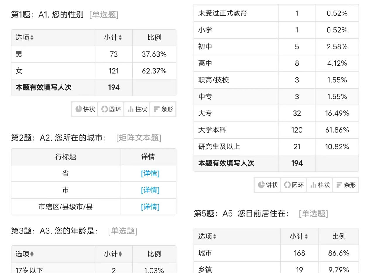 问卷调查采用线上、线下相结合的方式展开,通过问卷星网站制作问卷,将团队成员分成山东泰安、山东青岛、山东威海、山东省外四个地区小组同步发放。一方面,省外地区小组采用网络调查法,先后在微信、知乎、微博等各大平台发放问卷,以期覆盖更为广泛的地域和人群。另一方面,省内三个地区小组在社区、企事业单位、公园等地线下发放,集中填答与个别发送相结合,以广泛覆盖非网民群体,有效弥补线上发放方式的不足。此次问卷调查工作共计调查213人,回收有效调查问卷194份。