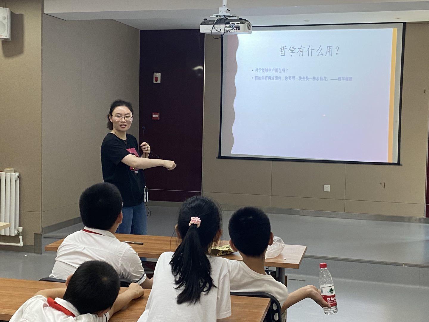 在哲学课堂上,从中国的百家思想到近代西方的哲学思想,从苏格拉底惊人的发现到黑格尔的辩证法,主讲人贾雨涵深入浅出地为小朋友们带来哲学的初体验,让孩子们了解到哲学离我们并不遥远,他立于众学科之上,是璀璨的指明星,它可以是生活中的点点滴滴,是在如何树林中采到自己最满意的果子,是先有鸡还是先有蛋的悖论,是岁岁年年的四季变化,也可以是影响万物的万有引力,使哲学如涓涓溪流从高高在上一点一滴的融入我们的生活。在课程中,还通过分组讨论、竞赛答题等方式在寓教于乐中增添了孩子们学习哲学的兴趣,埋下了孩子们热爱的种子,碰撞思想火花,启蒙哲学思想。