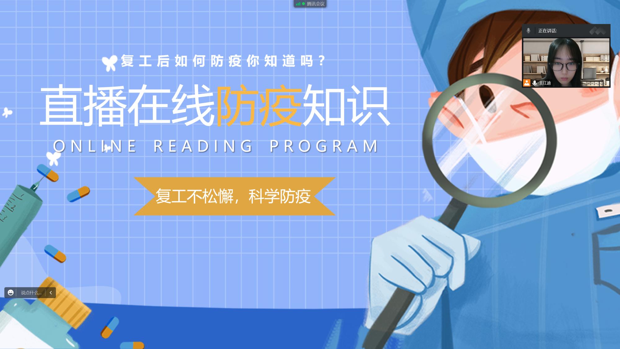 本次讲座分为“预防”、“治疗”以及“康复”三个方面。王江迪同学首先介绍了新冠病毒的由来及传播途径,随后讲解了一些日常防护措施以及人员出行居家的注意事项。其次介绍了新冠居家治疗人员自我管理基本要求和结束居家治疗的条件。最后,明确了康复的标准,分享了康复后的场所消杀以及自我恢复训练的方式、方法。