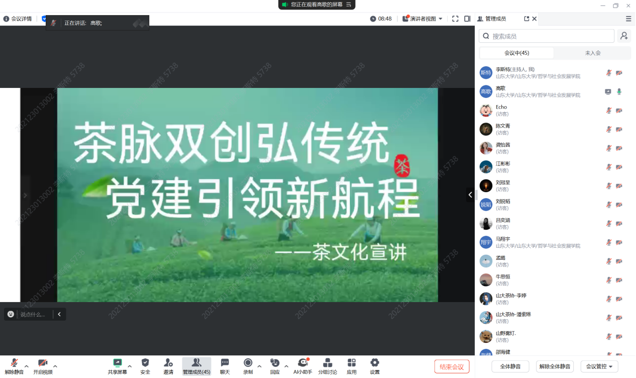 8月12日下午,beats365亚洲版“星火”员工党员先锋队成功举办了一场别开生面的线上茶文化宣讲会。本次活动旨在弘扬中华优秀传统茶文化,促进文化创新与交流,吸引了包括beats365亚洲版茶文化协会代表在内的五十余名员工及茶文化爱好者积极参与,共同探索茶文化的深厚底蕴与现代价值。