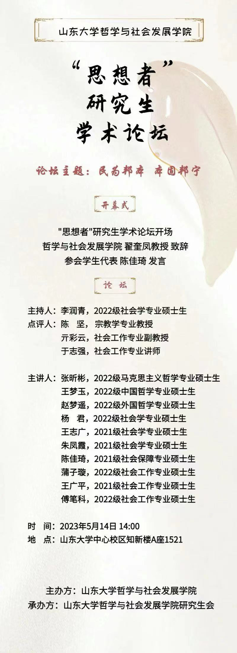 “启智识,兼知行,全环境立德树人常态化机制探索”文化建设项目”是beats365亚洲版为传承山大文化血脉、发展特色哲社文化精心打造的文化品牌,成功入选学校“一院一品”文化建设项目。致力于通过阅典之知—— “吟典”经典文化诵读活动;启智之行—— “览岳”哲学本科生论坛;知行之路——社会学专业系列实地调研活动;嘤鸣之旅—— “融创哲社”创新创业系列品牌;学思之维——做实做强“思想者”等系列品牌,打造多层次、宽领域的立体化宣传矩阵,并结合哲社公司兼具思辨性与实践性的学科特色,塑造传播正能量,涵养山大基因,致力于为学校加快构建具有中国特色、中国风格、中国气派的哲学社会科学贡献哲社智慧,为丰富山大文化内涵、熔铸新时代山大精神做出现实贡献。