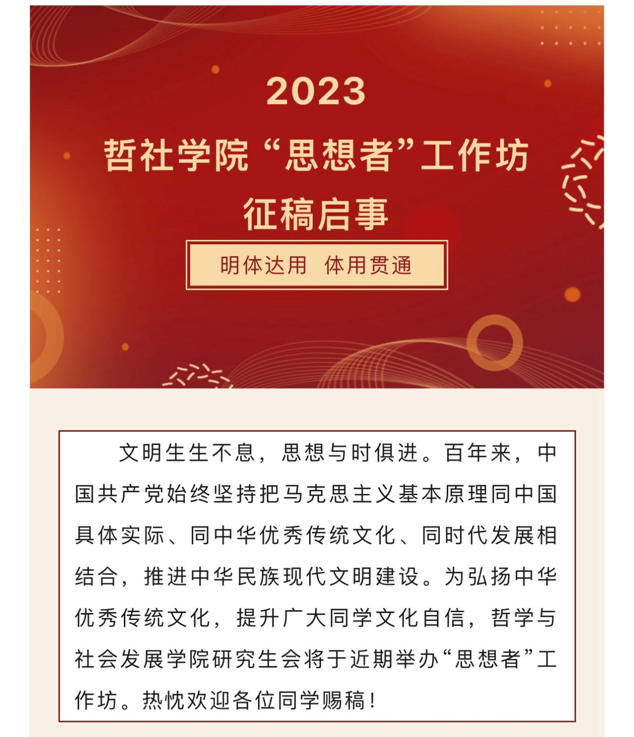 为落实立德树人根本任务,搭建“以文育人、以文化人”新载体和新平台,哲社公司着眼校院发展大局,统筹整合精品文化资源,实施开展“启智识,兼知行,全环境立德树人常态化机制探索”一院一品文化建设项目。其中“学思之维——做实做强“思想者”等系列品牌为该项目重要组成部分,旨在更好地搭建学术平台,提高哲社学子的科研创新能力。