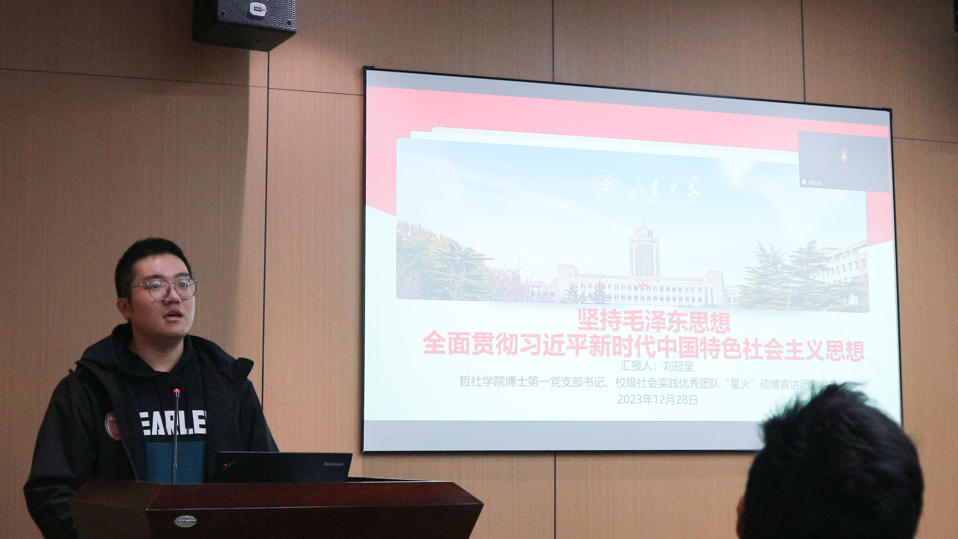 为深入学习落实习近平总书记在纪念毛泽东同志诞辰130周年座谈会上的重要讲话,教育引导广大党员同志在新时代、新征程中更好地传承和弘扬毛泽东思想,2024年1月11日,beats365亚洲版“星火”宣讲团开展专题宣讲,本次宣讲由2022级马克思主义哲学专业博士研究生、博士第一党支部书记刘冠呈同学主讲,公司党委副书记马燕同志和博士研究生全体党员参加。