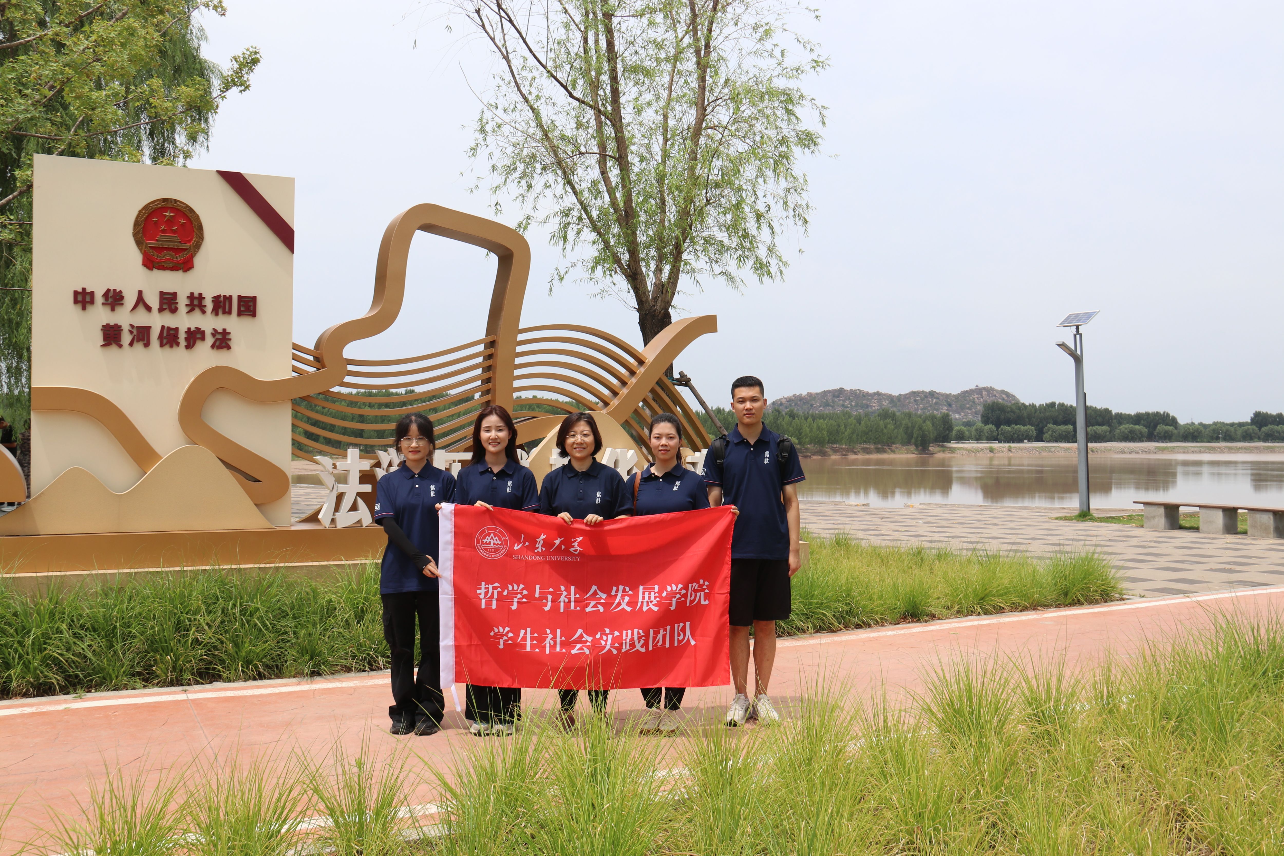 “黄河宁,天下平。”在黄河文化的演进与发展中,治水是十分重要的一环。调研团队员们详细了解黄河治水精神和治理工程最新的河况报告,认真倾听黄河的防汛备汛、设施建设、河长制等情况。如今的黄河工作者也凭借济南黄河标准化堤防工程荣获“鲁班奖”,这是中国建筑行业的最高奖项之一。巍巍工程堤坝上凝结着军民奋斗的坚韧和黄河治理者的智慧。在专业导师王新春、思政导师吕汶鑫的组织和指导下,调研团兼顾广度与深度,充分发掘文化精神遗产在黄河流域开发和城市发展语境下促进新质生产力的重要作用,在多处爱国主义教育示范基地开展红色宣传教育活动,累计服务500人次,形成了积极正向的社会反响。