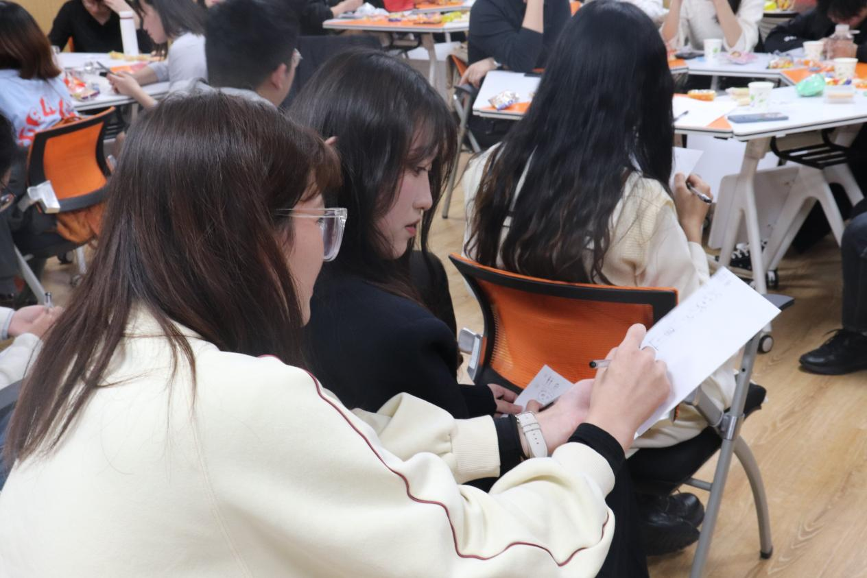 本次联谊活动共有四个主要游戏项目。研会各部门成员分组多轮次进行活动游戏。“五毛和一块”既拉近了同学们之间的距离,又在很大程度上增添了活动的趣味性。“数字炸弹”环节也是笑语连连,更多的也是对大家运气的考验。“画画接龙”环节考验小组成员之间的合作和默契程度,各组回答展示的结果让现场欢笑声不绝。随着比赛的进行,大家的热情越来越高涨。“猜歌名”游戏环节考验着参赛队员的临场反应、彼此配合能力以及自身曲库丰富程度。在一场场趣味游戏中,研会各部门成员获得了欢乐,收获了友谊;增进了彼此之间的了解,培养了相互之间的默契。